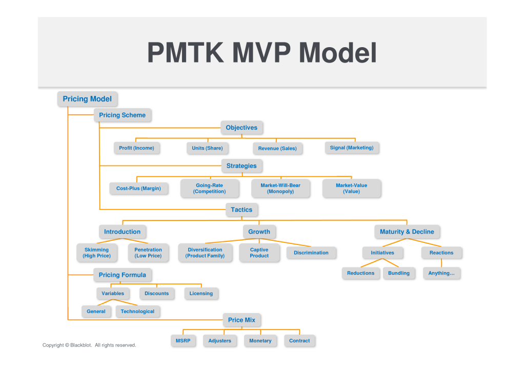 Developed by Blackblot, the PMTK Market-Value Pricing Model (MVP Model) is a market-value centric pricing process which guides sets of managerial decisions that help determine a product's price.